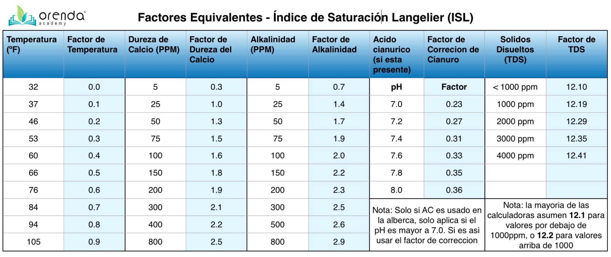 (pH) + (Temperatura ºF) + (Dureza del Calcio) + [(Alcalinidad Total) - (AC y factor de corrección en pH actual)] - (SDT) = ISL